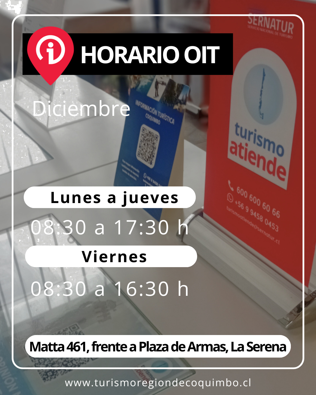 En el mes de diciembre, la Oficina de Informaciones Turísticas de SERNATUR ha dispuesto mantener horario para atender a todos los visitantes y ciudadanos que deseen hasta el 31 de diciembre.