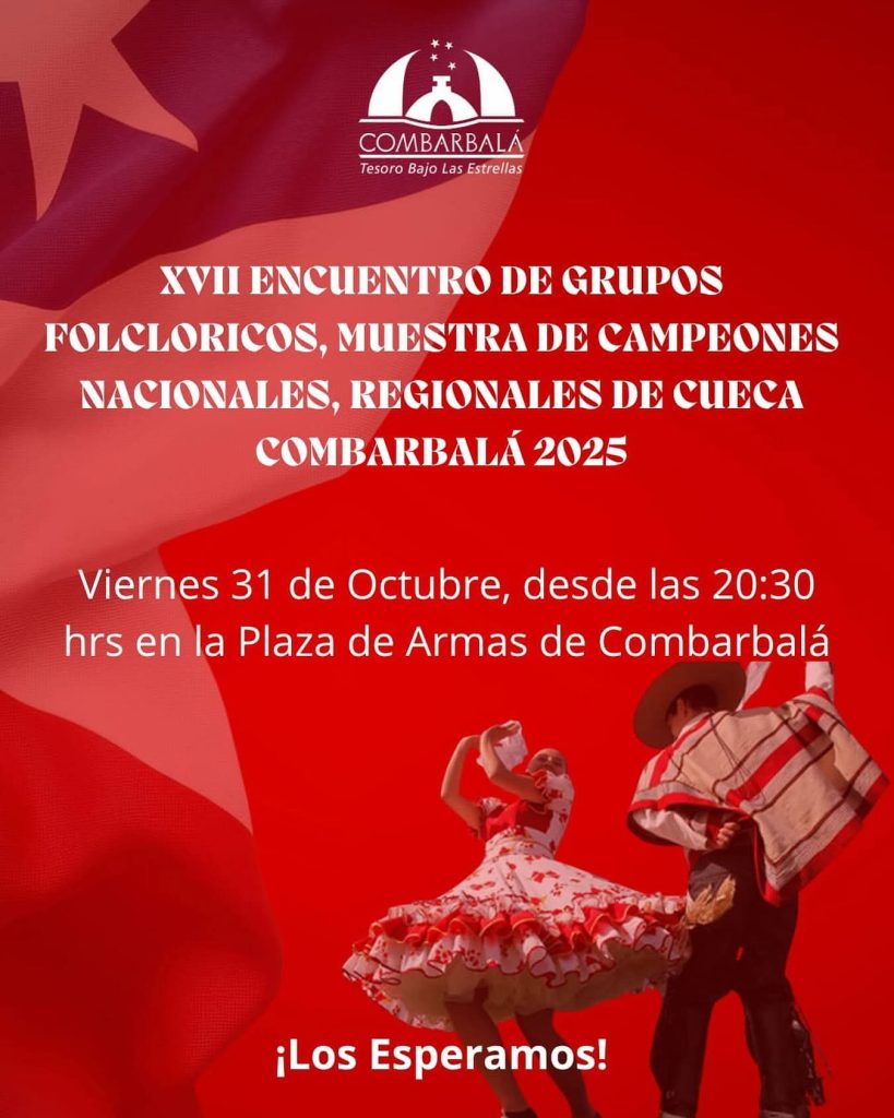 vie31oct20:30vie22:30XVII Encuentro de grupos folclórico y muestra de campeones regionales de cueca - Combarbalá20:30 - 22:30(GMT+00:00) Combarbalá