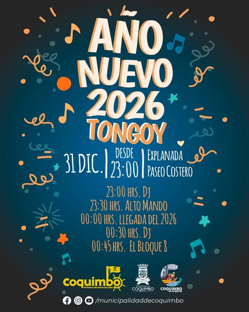 Este 31 de diciembre, te invitamos a ser parte de la gran Fiesta de Año Nuevo en Tongoy, una noche especial para reunirse en familia y amigos para celebrar y dar la bienvenida al 2026 con música, baile y buena energía.