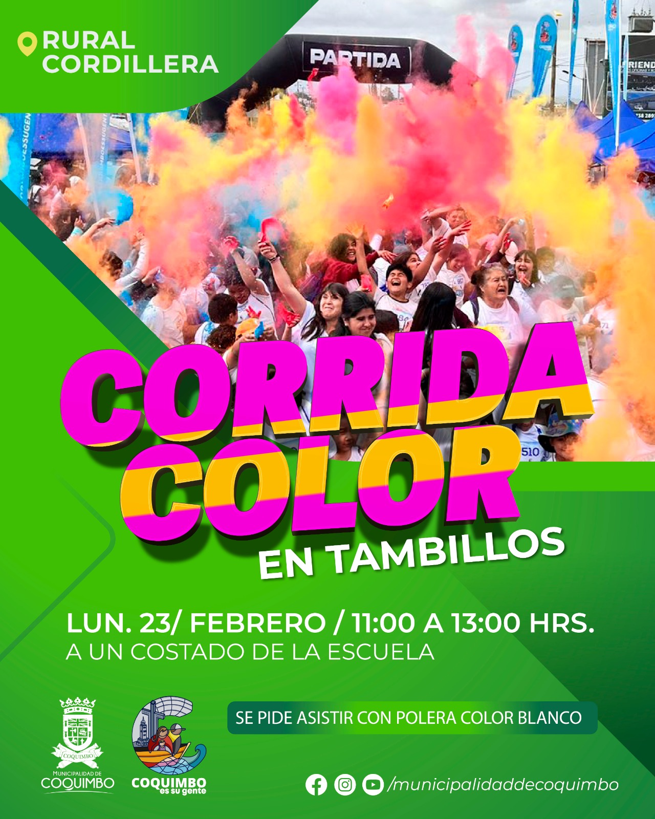 Una gran fiesta familiar se vivirá este lunes 23 de febrero desde las 11:00 horas gracias a la Corrida Color sector Tambillos. El recorrido se realizará a un costado de la escuela.