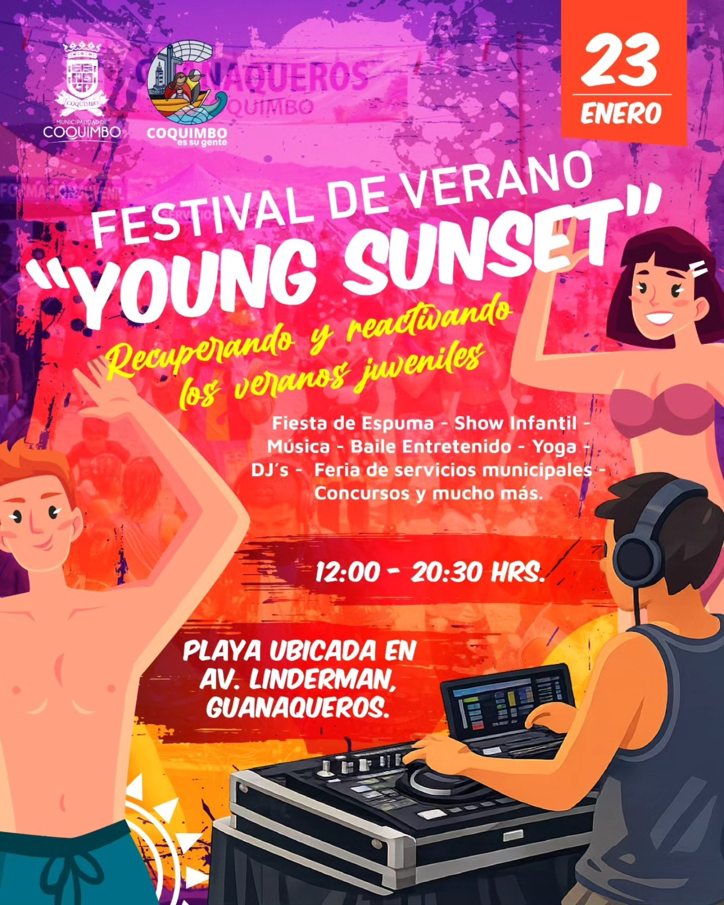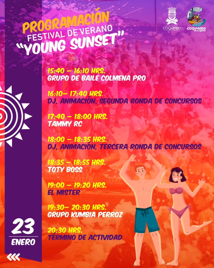 La Municipalidad de Coquimbo, a través de su Departamento de Cultura, invita a jóvenes, familias y visitantes a disfrutar del Festival de Verano “Young Sunset”, una jornada llena de música, baile, energía y entretención frente al mar.