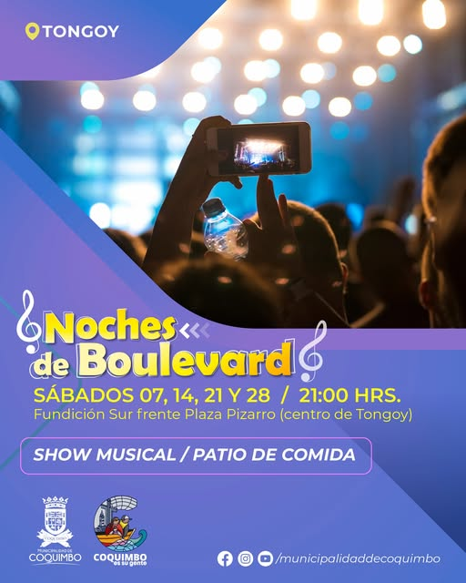 Las noches de boulevar en Tongoy te esperan con un show musical y patio de comidas en Avda. Fundición Sur frente a Plaza Pizarro los sábados 07, 14, 21 y 28 de febrero.