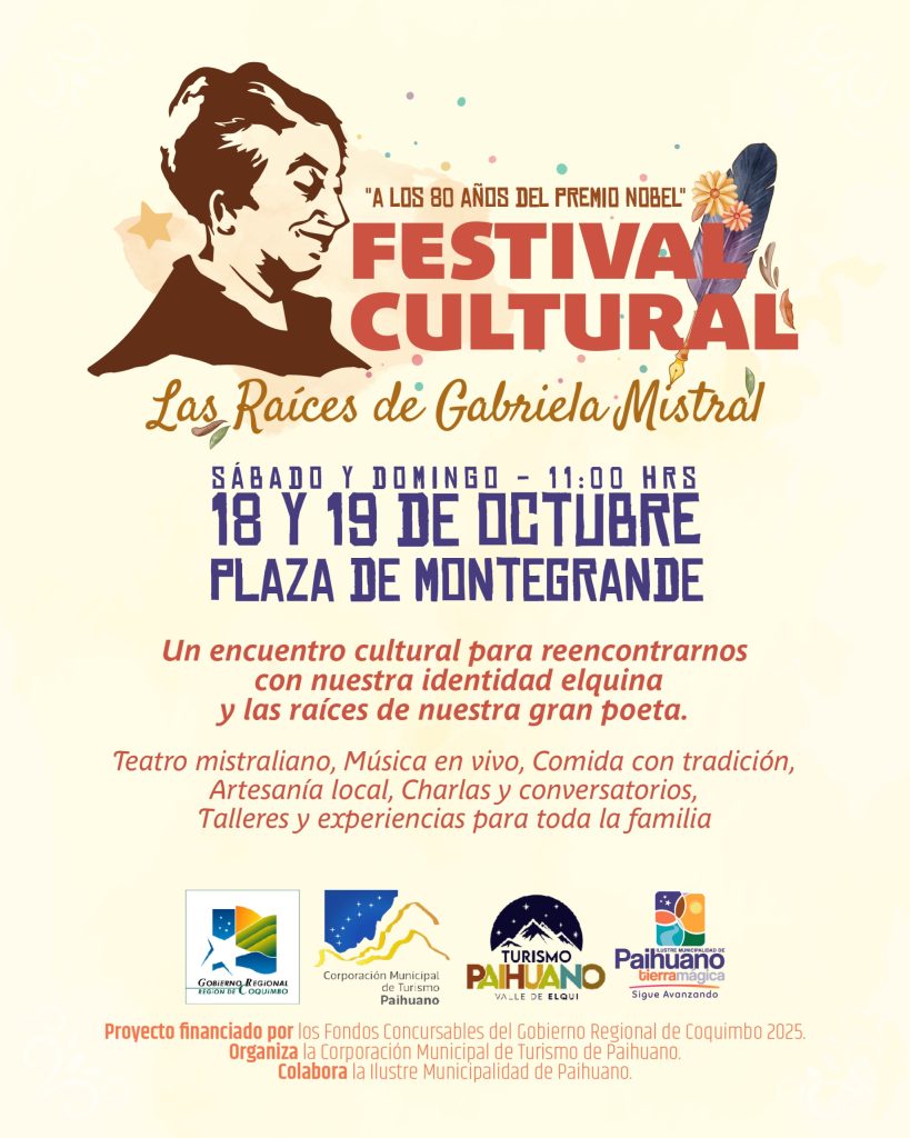 sab18oct(oct 18)11:00dom19(oct 19)18:00Festival Cultural "Las Raices de Gabriela Mistral" - Paihuano11:00 - 18:00 (19)(GMT+00:00) Paihuano